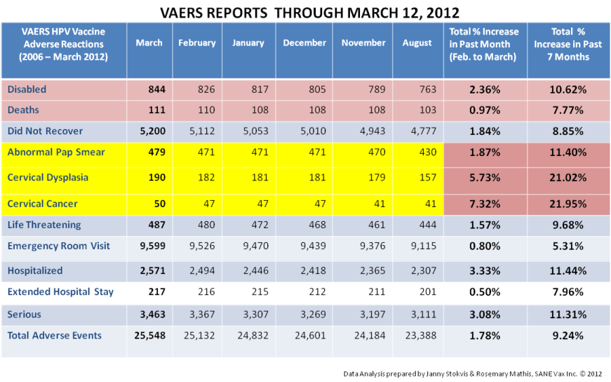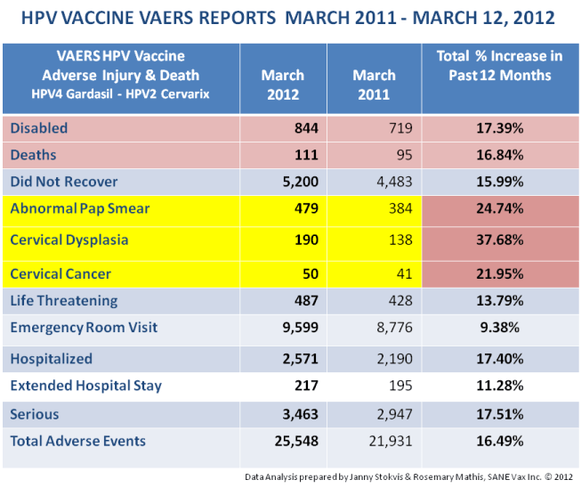 The first slide shows an alarming percent increase in HPV Vaccine adverse injuries and deaths between March 2011 and March 2012.
