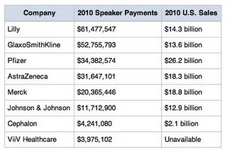 The pharmaceutical industry has been very generous in making payments to physicians. Last year (2010), for example, just12 pharmaceutical companies paid $760 million to physicians and other health care providers for consulting, speaking, research and expenses, according to ProPublica’s “” project. ProPublica has taken “translucent” — ie, difficult to analyze — data reported by pharmaceutical companies and created a single database that makes comparisons simple (see here).